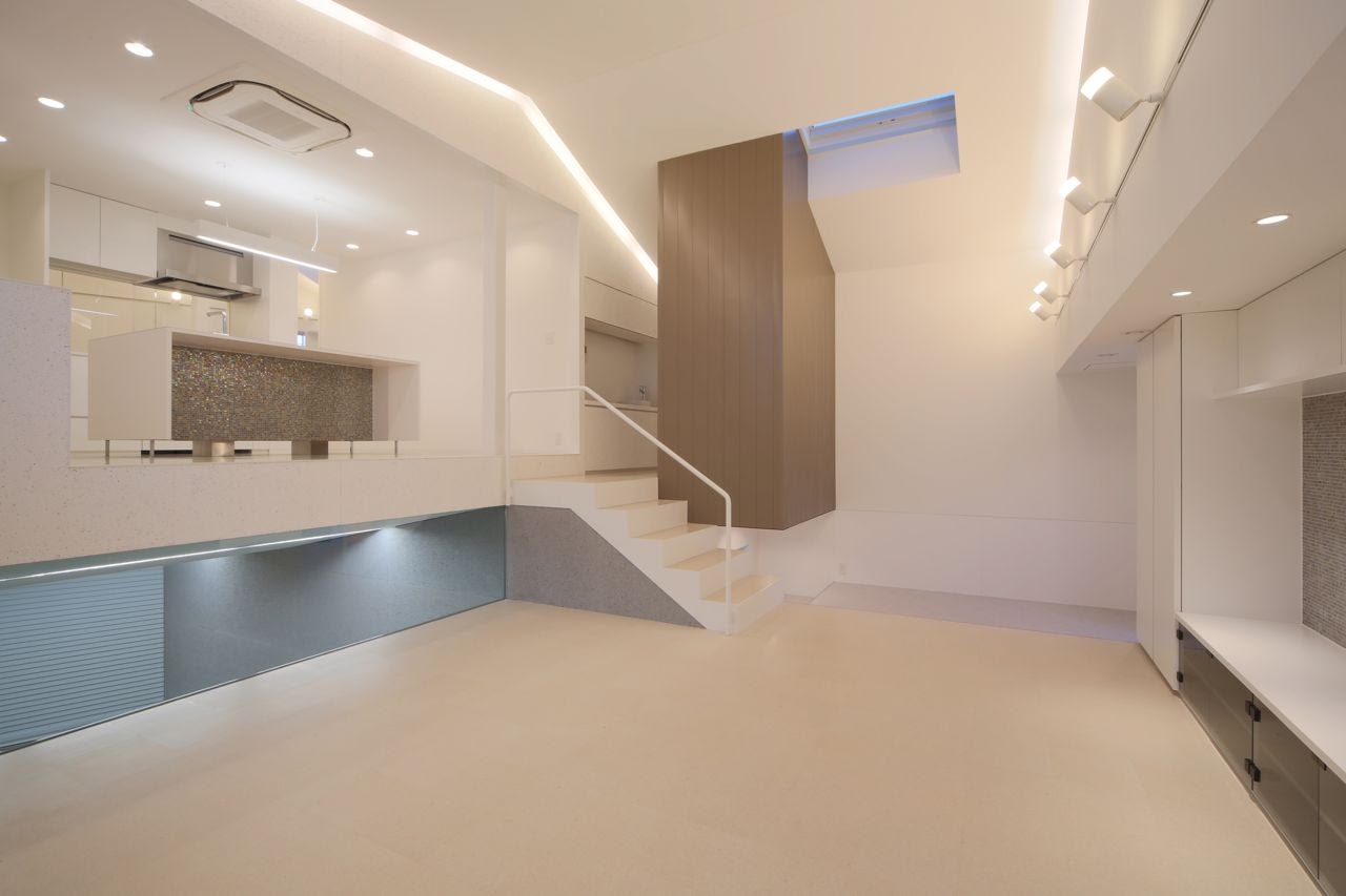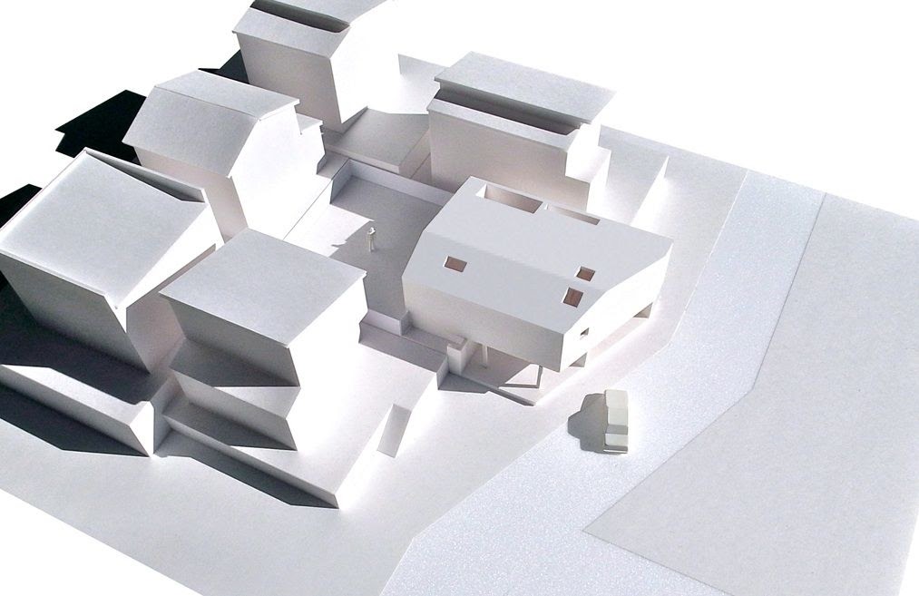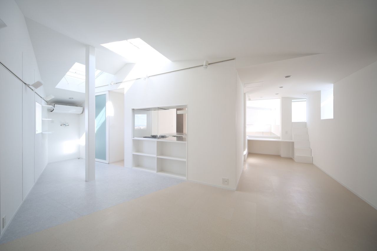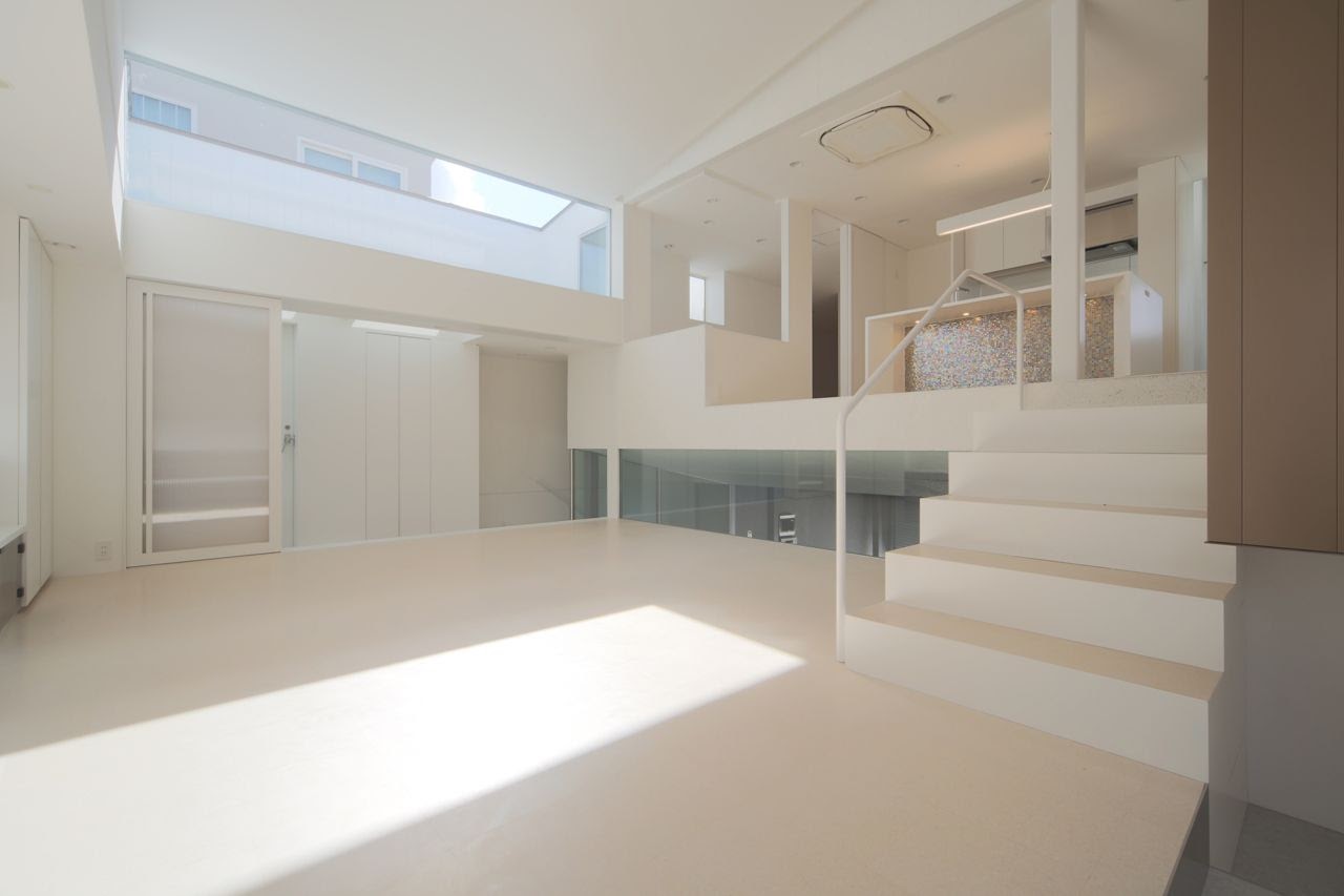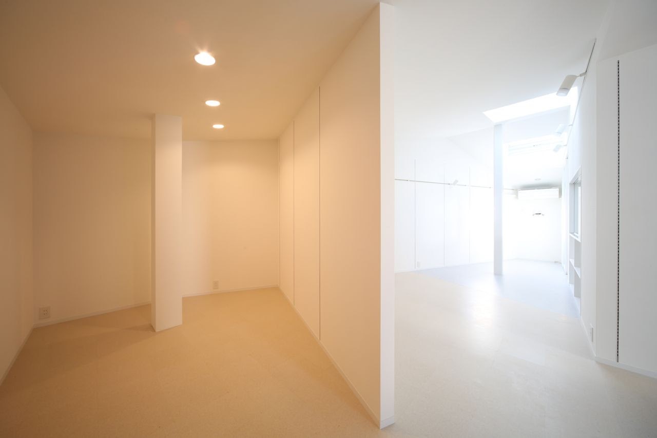 閉鎖的に見える外観とは裏腹に、内部はあらゆる方向から光が入る明るい空間が広がる。