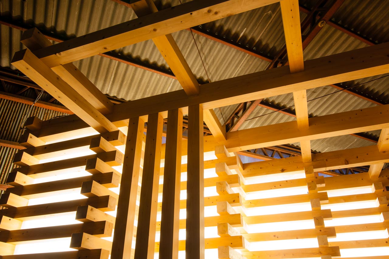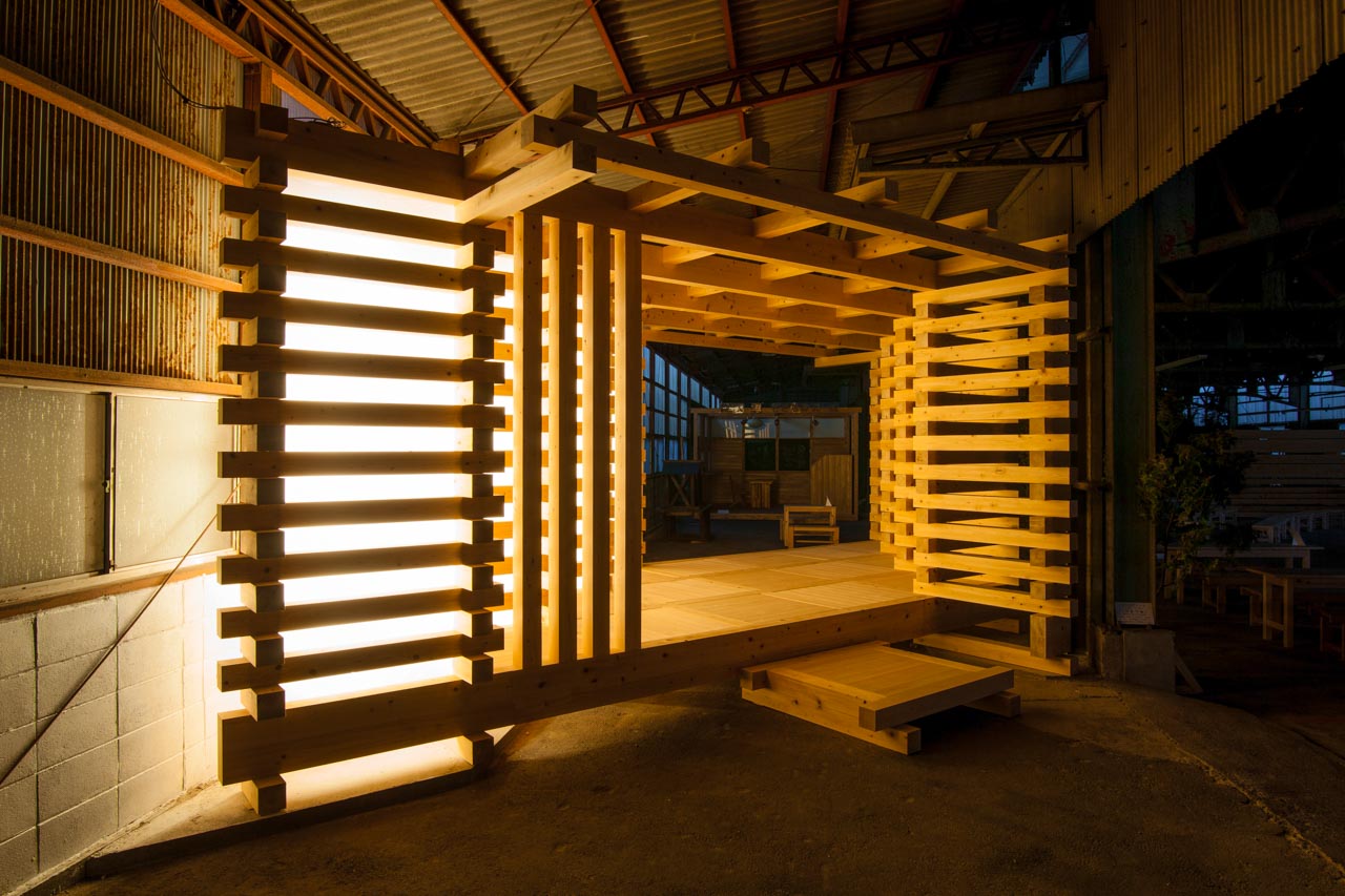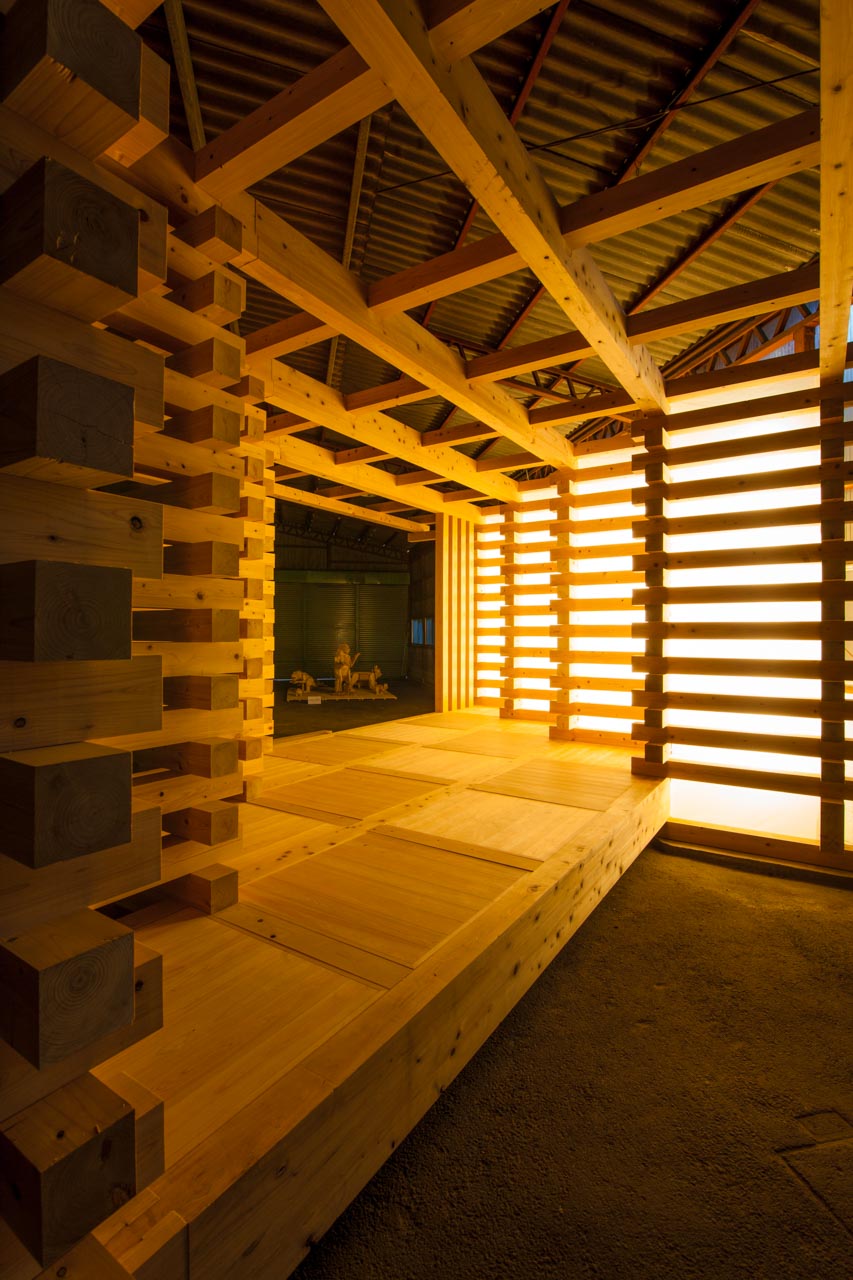 このパビリオンでは一般住宅の柱や土台に使用される角材を積み重ね空間を作り、香川県産のヒノキが良質で均質な材料であることを見て触れて体験できる建物とした。